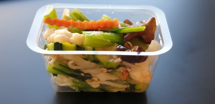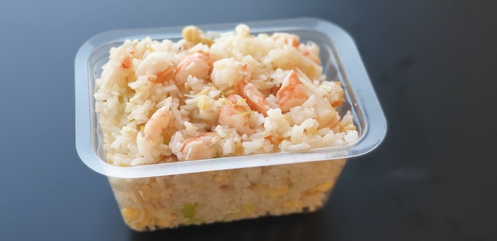 Crevette, soja, carotte râpée, chou blanc, salade et sauce